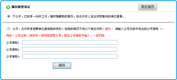 2)在打開(kāi)的頁(yè)面中,選擇 公開(kāi),允許所有招聘單位查閱我的資料;但我的簡(jiǎn)歷不向以下單位開(kāi)放( 提示: 請(qǐng)輸入公司名稱(chēng)中包含的公司簡(jiǎn)稱(chēng) ):按下圖所示,對(duì)號(hào)入座填入信息,點(diǎn)擊保存按鈕即可.