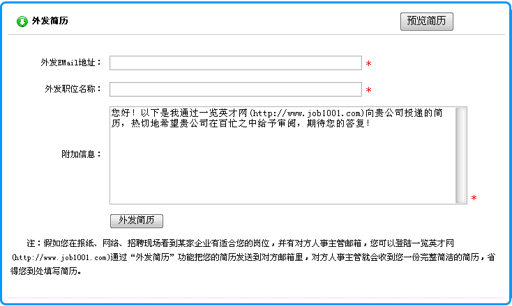 2) 在打開(kāi)的頁(yè)面中,輸入接收企業(yè)的Email地址、應(yīng)聘的職位名稱(chēng)以及您的其它要求后,點(diǎn)擊"發(fā)送簡(jiǎn)歷"按鈕就可以了。如下圖所示: